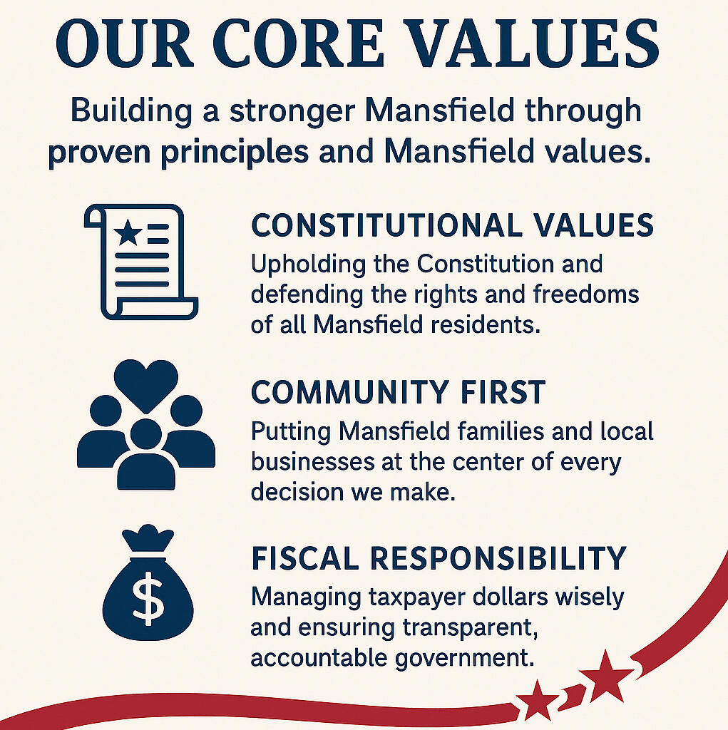 We are committed to upholding the Constitution and defending the rights and freedoms of every Mansfield resident. Our goal is to preserve the liberties that form the foundation of our community and nation.Community First